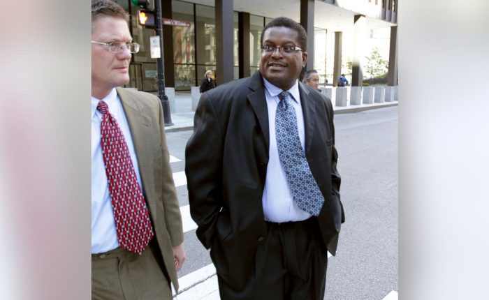 Former Chicago police Sgt. Ronald Watts, right, leaves the Dirksen U.S. Courthouse after being sentenced to 22 months in prison in 2013. (Phil Velasquez/Chicago Tribune/Tribune News Service via Getty …