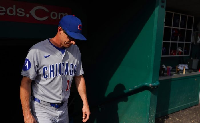 CINCINNATI, OHIO – SEPTEMBER 21: Craig Counsell #11 of the Chicago Cubs walks into the dugout during the seventh inning of a baseball game against the Cincinnati Reds at …