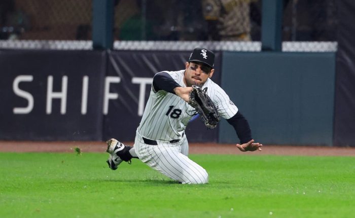 CHICAGO, ILLINOIS – SEPTEMBER 20: Mike Tauchman #18 of the Chicago White Sox catches a fly ball during the fifth inning against the San Diego Padres at Rate Field …