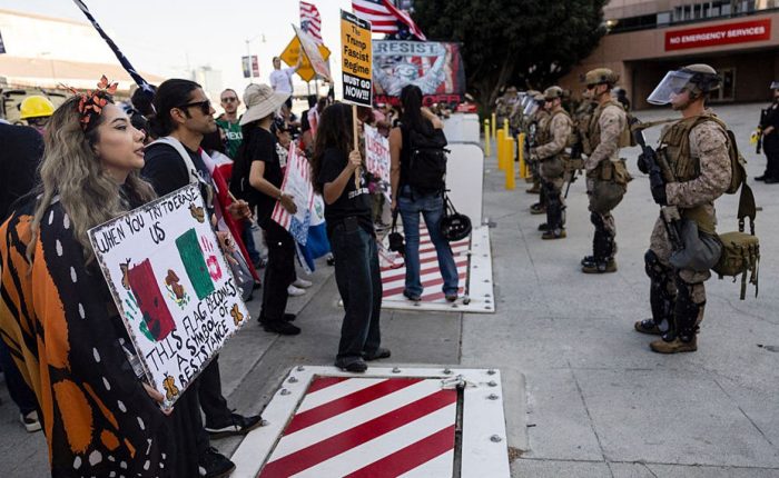 Demonstrators face a mix of US marines, national guards and Department of Homeland Security police officers standing guard as they protest in front of the Metropolitan Detention Center following …